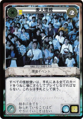 ![]() ![]() | 衆人監視 イベント LIMITED EDITION Ua 分類:環境 消費コスト:2 すべての怪獣使いは、手札にある全てのカードをつねに場にさらしてプレイしなければならない。これらは手札として扱う。 相手に全てを知られていることほどやりにくいことはない 出典:1992 ゴジラVSモスラ |