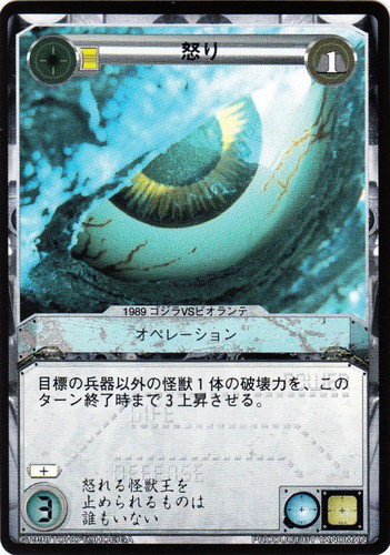 ![]() ![]() | 怒り オペレーション LIMITED EDITION C 消費コスト:1 破壊力:3 目標の兵器以外の怪獣1体の破壊力を、このターン終了時まで3上昇させる。 怒れる怪獣王を止められるものは誰もいない 出典:1989 ゴジラVSビオランテ |