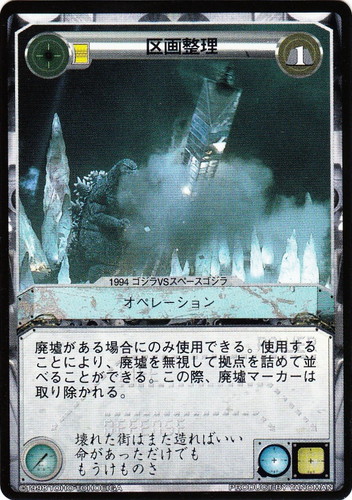 ![]() ![]() | 区画整理 オペレーション LIMITED EDITION C 消費コスト:1 廃墟がある場合にのみ使用できる。使用することにより、廃墟を無視して拠点を詰めて並べることができる。この際、廃墟マーカーは取り除かれる。 壊れた街はまた造ればいい 命があっただけでももうけものさ 出典:1994 ゴジラVSスペースゴジラ |