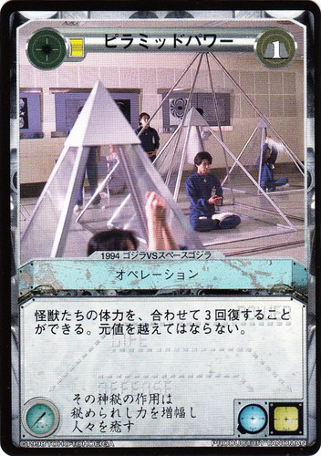 ![]() ![]() | ピラミッドパワー オペレーション LIMITED EDITION C 消費コスト:1 怪獣たちの体力を、合わせて3回復することができる。元値を越えてはならない。 その神秘の作用は秘められし力を増幅し人々を癒す 出典:1994 ゴジラVSスペースゴジラ |