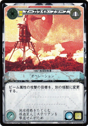 ![]() ![]() | マーカライト・ファーブ オペレーション LIMITED EDITION C 消費コスト:1 ビーム属性の攻撃の目標を、別の怪獣に変更する。 地球侵略をたくらむ怪遊星人ミステリアンを撃退せんがため 出典:1957 地球防衛軍 |