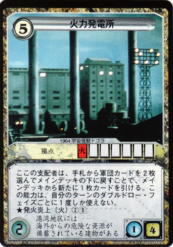 ![]() ![]() | 火力発電所 拠点 LIMITED EDITION C 属性:火 支配力:5 破壊力:2 防御力:1 体力:4 ここの支配者は、手札から軍団カードを2枚選んでメインデッキの下に戻すことで、メインデッキから新たに1枚カードを引ける。この能力は、自分のターンのダブルドロー・フェイズごとに1度しか使えない。 ★発火炎上(火) ②[0] 港湾地区には海外からの危険な資源が備蓄されている建物がある 出典:1964 宇宙怪獣ドゴラ |