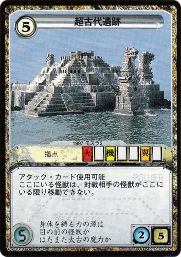 ![]() ![]() | 超古代遺跡 拠点 LIMITED EDITION C 属性:火/機/翼 支配力:5 破壊力:5 防御力:2 体力:5 アタック・カード使用可能 ここにいる怪獣は、対戦相手の怪獣がここにいる限り移動できない。 身体を縛る力の源は目の前の怪獣かはたまた太古の魔力か 出典:1997 モスラ2 |