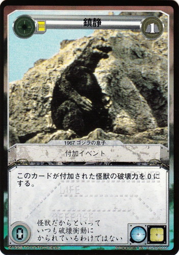 ![]() ![]() | 鎮静 イベント LIMITED EDITION C 分類:付加 消費コスト:1 破壊力:0 このカードが付加された怪獣の破壊力を0にする。 怪獣だからといっていつも破壊衝動にかられているわけではない 出典:1967 ゴジラの息子 |
