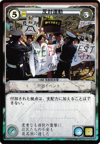 ![]() ![]() | 反対運動 イベント LIMITED EDITION R 分類:付加 消費コスト:3 付加された拠点は、支配力に加えることはできない。 度重なる怪獣の襲撃に住民たちの不安も最高潮に達した 出典:1968 怪獣総進撃 |