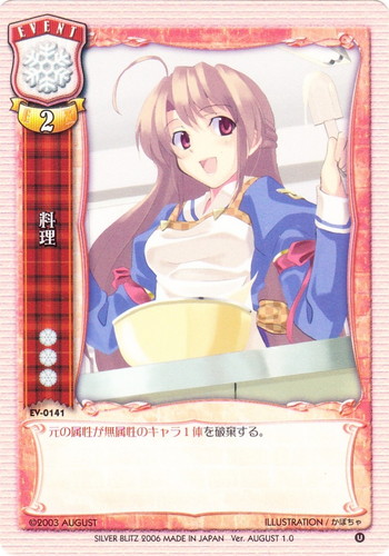 ![]() ![]() | EV-0141 料理 イベント Ver.AUGUST1.0 U 属性:雪 コスト:雪雪雪 EX:2 元の属性が無属性のキャラ1体を破棄する。 illust:かぼちゃ |