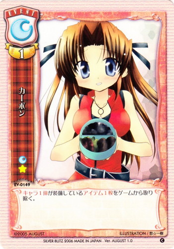 ![]() ![]() | EV-0149 カーボン イベント Ver.AUGUST1.0 C 属性:月 コスト:月無 EX:1 キャラ1体が装備しているアイテム1枚をゲームから取り除く。 illust:愁☆一樹 |