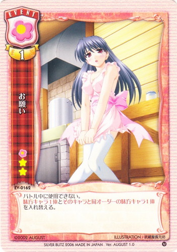 ![]() ![]() | EV-0162 お願い イベント Ver.AUGUST1.0 U 属性:花 コスト:花無無 EX:1 バトル中に使用できない。味方キャラ1体とそのキャラと同オーダーの味方キャラ1体を入れ替える。 illust:武蔵屋長元坊 |