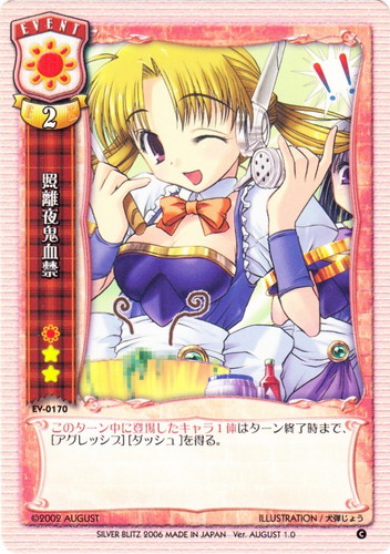 ![]() ![]() | EV-0170 照離夜鬼血禁 イベント Ver.AUGUST1.0 C 属性:日 コスト:日無無 EX:2 このターン中に登場したキャラ1体はターン終了時まで、[アグレッシブ][ダッシュ]を得る。 illust:犬弾じょう |