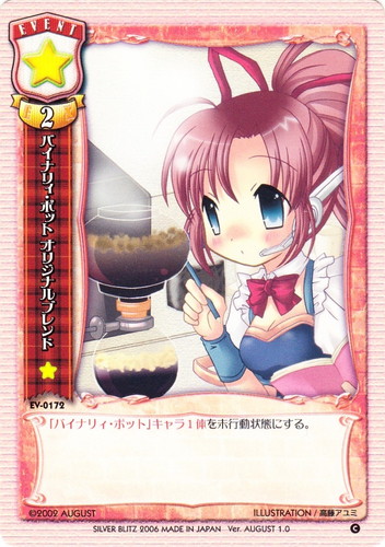 ![]() ![]() | EV-0172 バイナリィ・ポット オリジナルブレンド イベント Ver.AUGUST1.0 C 属性:無 コスト:無 EX:2 「バイナリィ・ポット」キャラ1体を未行動状態にする。 illust:高藤アユミ |