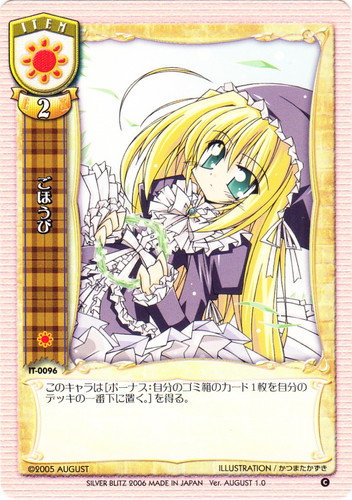 ![]() ![]() | IT-0096 ごほうび アイテム Ver.AUGUST1.0 C 属性:日 コスト:日 EX:2 このキャラは[ボーナス:自分のゴミ箱のカード1枚を自分のデッキの一番下に置く。]を得る。 illust:かつまたかずき |