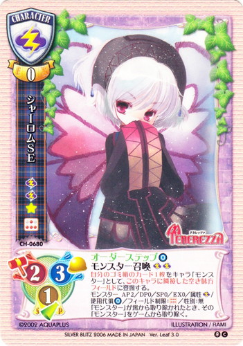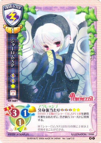 ![]() ![]() | CH-0681 シャーロムXP キャラ Ver.Leaf3.0 C 属性:雷 性別:女性 作品名:テネレッツァ コスト:雷雷無 EX:1 AP:3 DP:1 SP:1 アグレッシブ 分身体当たり[雷][雷][雷][無][無] 自分のゴミ箱の「シャーロムXP」1体を使用代償を支払わずに、空き味方フィールドに登場する。 ※「シャーロムXP」は自分の場に2体以上登場することができる。 illust:RAMI |