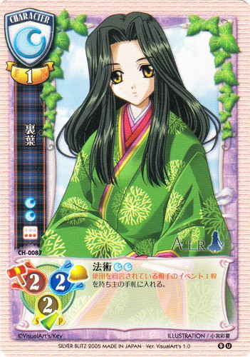 ![]() ![]() | CH-0087 裏葉 キャラ Ver.VisualArt’s1.0 U 属性:月 性別:女性 作品名:AIR コスト:月月 EX:1 AP:2 DP:2 SP:2 法術[月][月] 使用を宣言されている相手のイベント1枚を持ち主の手札に入れる。 illust:小宮彩夏 |