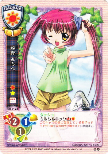 ![]() ![]() | CH-0123 遠野 みちる キャラ Ver.VisualArt’s1.0 U 属性:日 性別:女性 作品名:AIR コスト:日無 EX:1 AP:2 DP:1 SP:1 ダッシュ ちるちるキック[T][日] このキャラの前に登場している相手AFキャラ1体を同列の空き相手DFに移動する。 illust:ひめはち |