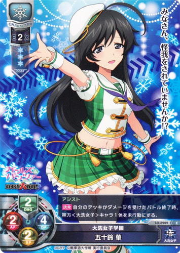 ![]() ![]() | LO-0289 大洗女子学園 五十鈴 華 キャラクター Ver.ガールズ&パンツァー 戦車道大作戦! 1.0 C 属性:雪 EX:2 コスト:雪雪雪 タイプ:大洗女子 AP:2 DP:4 SP:2 DMG:2 アシスト 【誘発】自分のデッキがダメージを受けたバトル終了時、味方<大洗女子>キャラ1体を未行動にする。 みなさん、怪我をされていませんか!? 作品名:ガールズ&パンツァー 戦車道大作戦! スターターデッキ収録 |