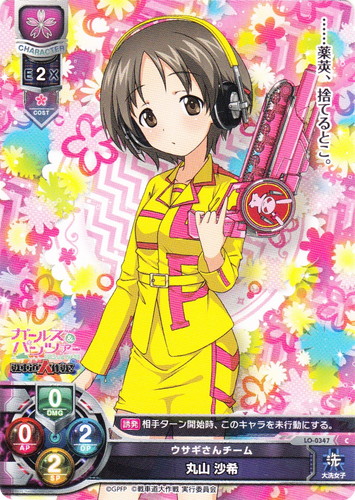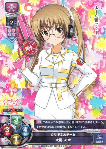 ![]() ![]() | LO-0350 ウサギさんチーム 大野 あや キャラクター Ver.ガールズ&パンツァー 戦車道大作戦! 1.0 C 属性:花 EX:2 コスト:花花花花 タイプ:大洗女子 AP:3 DP:4 SP:1 DMG:3 【誘発】このキャラが登場したとき、味方「ウサギさんチーム」キャラが3体以上の場合、1枚ドローする。 よーく狙ってー。 作品名:ガールズ&パンツァー 戦車道大作戦! スターターデッキ収録 |