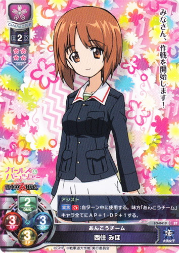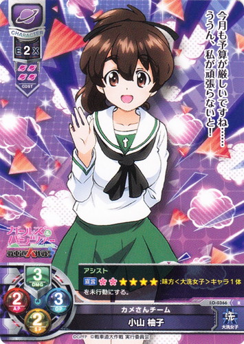 ![]() ![]() | LO-0362 カメさんチーム 河嶋 桃 キャラクター Ver.ガールズ&パンツァー 戦車道大作戦! 1.0 R 属性:宙 EX:1 コスト:宙 タイプ:大洗女子 AP:3 DP:4 SP:0 DMG:0 アシスト ふっ、ここがお前らの死に場所だ! illust:かがちさく 作品名:ガールズ&パンツァー 戦車道大作戦! スターターデッキ収録 |