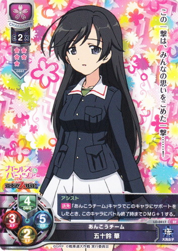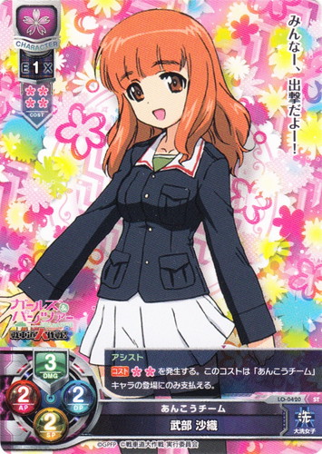 ![]() ![]() | LO-0420 あんこうチーム 武部 沙織 キャラクター Ver.ガールズ&パンツァー 戦車道大作戦! 1.0 ST 属性:花 EX:1 コスト:花花花花 タイプ:大洗女子 AP:2 DP:2 SP:2 DMG:3 アシスト 【コスト】[花花]を発生する。このコストは「あんこうチーム」キャラの登場にのみ支払える。 みんなー、出撃だよー! 作品名:ガールズ&パンツァー 戦車道大作戦! スターターデッキ収録 |