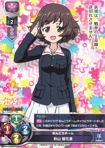 ![]() ![]() | LO-1126 あんこうチームの砲手 五十鈴 華 キャラクター Ver.ガールズ&パンツァー 最終章 1.0 ST 属性:花 EX:2 コスト:花花 タイプ:大洗女子 ブランド:GUP AP:1 DP:2 SP:3 DMG:1 アシスト 【宣言】(0):味方<大洗女子>キャラの属性が4種類以上の場合、このキャラにDP+1する。 そんな事になったら道が断たれてしまいます。 作品名:ガールズ&パンツァー 最終章 スターターデッキ収録 |