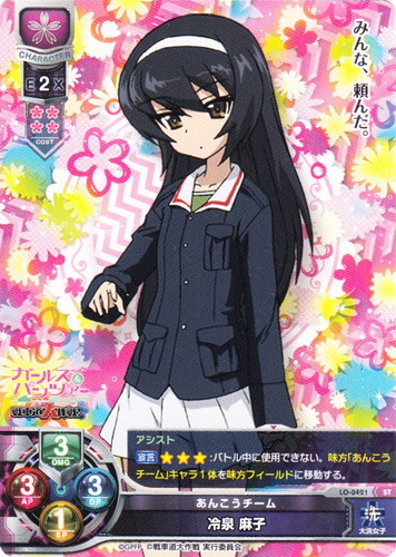 ![]() ![]() | LO-0421 あんこうチーム 冷泉 麻子 キャラクター Ver.ガールズ&パンツァー 戦車道大作戦! 1.0 ST 属性:花 EX:2 コスト:花花花花 タイプ:大洗女子 AP:3 DP:3 SP:1 DMG:3 アシスト 【宣言】[無無無]:バトル中に使用できない。味方「あんこうチーム」キャラ1体を味方フィールドに移動する。 みんな、頼んだ。 作品名:ガールズ&パンツァー 戦車道大作戦! スターターデッキ収録 |