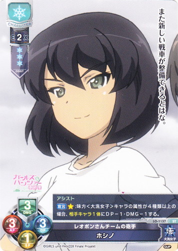 ![]() ![]() | LO-1137 レオポンさんチームの砲手 ホシノ キャラクター Ver.ガールズ&パンツァー 最終章 1.0 ST 属性:雪 EX:2 コスト:雪雪雪 タイプ:大洗女子 ブランド:GUP AP:3 DP:3 SP:1 DMG:3 アシスト 【宣言】[無]:味方<大洗女子>キャラの属性が4種類以上の場合、相手キャラ1体にDP-1・DMG-1する。 また新しい戦車が整備できるとはな。 作品名:ガールズ&パンツァー 最終章 スターターデッキ収録 |