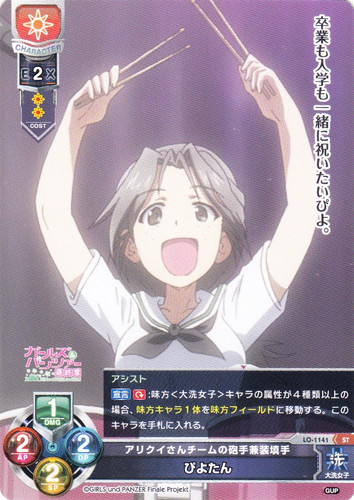 ![]() ![]() | LO-1141 アリクイさんチームの砲手兼装填手 ぴよたん キャラクター Ver.ガールズ&パンツァー 最終章 1.0 ST 属性:日 EX:2 コスト:日日 タイプ:大洗女子 ブランド:GUP AP:2 DP:2 SP:2 DMG:1 アシスト 【宣言】[T]:味方<大洗女子>キャラの属性が4種類以上の場合、味方キャラ1体を味方フィールドに移動する。このキャラを手札に入れる。 卒業も入学も一緒に祝いたいぴよ。 作品名:ガールズ&パンツァー 最終章 スターターデッキ収録 |