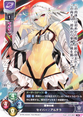 ![]() ![]() | LO-1382 軍神の剣 セイバー/アルテラ キャラクター Ver.Fate/Grand Order 3.0 R 属性:宙 EX:1 コスト:宙宙宙宙 タイプ:サーヴァント ブランド:TM AP:4 DP:3 SP:0 DMG:4 オーダーステップ:(0) 【宣言】(0):防御キャラの指定されているこのキャラのバトル中に使用する。相手のデッキを1枚破棄する。 この肉体には初めから戦いの紋が刻まれていた。 この両手は、初めから軍神の剣を握っていた。 illust:さがら梨々 作品名:Fate/Grand Order スターターデッキ収録 |