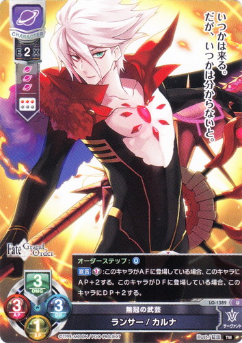 ![]() ![]() | LO-1389 無冠の武芸 ランサー/カルナ キャラクター Ver.Fate/Grand Order 3.0 U 属性:宙 EX:2 コスト:宙宙宙 タイプ:サーヴァント ブランド:TM AP:3 DP:3 SP:1 DMG:3 配置制限: ●●● ○○○ オーダーステップ:(0) 【宣言】[1]:このキャラがAFに登場している場合、このキャラにAP+2する。このキャラがDFに登場している場合、このキャラにDP+2する。 いつかは来る。 だが、いつかは分からないと。 illust:鉦田 作品名:Fate/Grand Order スターターデッキ収録 |