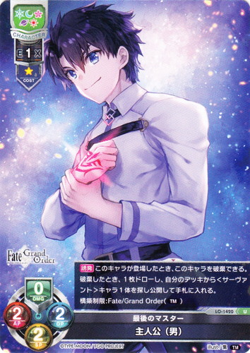![]() ![]() | LO-1420 最後のマスター 主人公(男) キャラクター Ver.Fate/Grand Order 3.0 U 属性:雪/月/花/宙/日 EX:1 コスト:無 ブランド:TM AP:2 DP:2 SP:2 DMG:0 【誘発】このキャラが登場したとき、このキャラを破棄できる。破棄したとき、1枚ドローし、自分のデッキから<サーヴァント>キャラ1体を探し公開して手札に入れる。 構築制限:Fate/Grand Order(TM) illust:集 作品名:Fate/Grand Order スターターデッキ収録 |