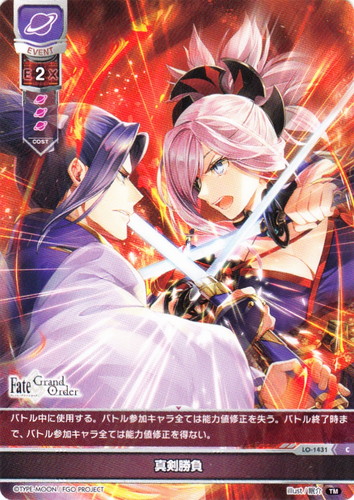 ![]() ![]() | LO-1431 真剣勝負 イベント Ver.Fate/Grand Order 3.0 C 属性:宙 EX:2 コスト:宙宙宙 ブランド:TM バトル中に使用する。バトル参加キャラ全ては能力値修正を失う。バトル終了時まで、バトル参加キャラ全ては能力値修正を得ない。 illust:眠介 作品名:Fate/Grand Order スターターデッキ収録 |