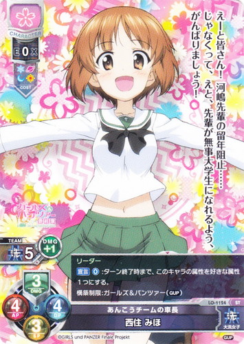 ![]() ![]() | LO-1124 あんこうチームの車長 西住 みほ キャラクター Ver.ガールズ&パンツァー 最終章 1.0 ST 属性:花 EX:0 コスト:雪月宙日 タイプ:大洗女子 ブランド:GUP AP:4 DP:4 SP:3 DMG:3 【TEAM:大洗女子5】DMG+1 リーダー 【宣言】(0):ターン終了時まで、このキャラの属性を好きな属性1つにする。 構築制限:ガールズ&パンツァー(GUP) えーと皆さん!河嶋先輩の留年阻止・・・・・・ じゃなくって、えと、先輩が無事大学生になれるよう、がんばりましょう! 作品名:ガールズ&パンツァー 最終章 スターターデッキ収録 |