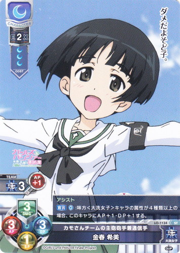 ![]() ![]() | LO-1134 カモさんチームの手法砲手兼通信手 金春 希美 キャラクター Ver.ガールズ&パンツァー 最終章 1.0 ST 属性:月 EX:2 コスト:月月月 タイプ:大洗女子 ブランド:GUP AP:3 DP:3 SP:1 DMG:3 【TEAM:大洗女子3】AP+1 アシスト 【宣言】(0):味方<大洗女子>キャラの属性が4種類以上の場合、このキャラにAP+1・DP+1する。 ダメだよそど子。 作品名:ガールズ&パンツァー 最終章 スターターデッキ収録 |