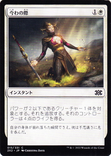 ![]() ![]() | 2X2 015 今わの際 インスタント ダブルマスターズ2022 C 色:白 マナコスト:(1)(白) パワーが2以下であるクリーチャー1体を対象とする。それを追放する。それのコントローラーは4点のライフを得る。 自分の身体が崩れ落ちた瞬間でさえ、彼は不思議さに息を呑んだ。 illust:CHRISTINA DAVIS |