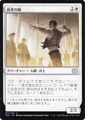 ![]() ![]() | 2X2 017 弱者の師 クリーチャー ダブルマスターズ2022 U 色:白 サブタイプ:人間・兵士 マナコスト:(2)(白) パワー:2 タフネス:2 パワーが2以下でありこれでないクリーチャー1体があなたのコントロール下で戦場に出るたび、あなたは(1)を支払ってもよい。そうしたなら、カード1枚を引く。 「これらの広間では、成功も失敗もありません。真の試練は最初の満月と共に訪れます。」 illust:JANA SCHIRMER&JOHANNES VOSS |