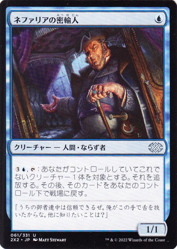 ![]() ![]() | 2X2 061 ネファリアの密輸人 クリーチャー ダブルマスターズ2022 U 色:青 サブタイプ:人間・ならず者 マナコスト:(青) パワー:1 タフネス:1 (3)(青), [T]:あなたがコントロールしていてこれでないクリーチャー1体を対象とする。それを追放する。その後、そのカードをあなたのコントロール下で戦場に戻す。 「うちの御者連中は信頼できるぜ。俺がこの手で舌を抜いたからな。他に知りたいことは?」 illust:MATT STEWART |