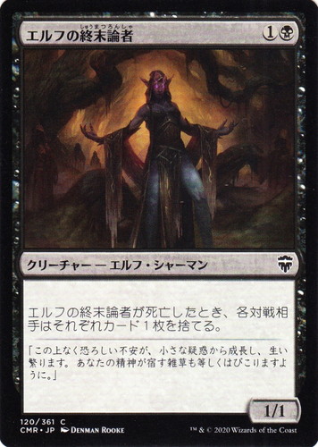 ![]() ![]() | CMR 120 エルフの終末論者 クリーチャー 統率者レジェンズ C 色:黒 サブタイプ:エルフ・シャーマン マナコスト:(1)(黒) パワー:1 タフネス:1 エルフの終末論者が死亡したとき、各対戦相手はそれぞれカード1枚を捨てる。 「この上なく恐ろしい不安が、小さな疑惑から成長し、生い繁ります。あなたの精神が宿す雑草も等しくはびこりますように。」 illust:DENMAN ROOKE |