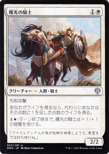 ![]() ![]() | DMU 023 曙光の騎士 クリーチャー 団結のドミナリア U 色:白 サブタイプ:人間・騎士 マナコスト:(1)(白) パワー:2 タフネス:2 先制攻撃 あなたがライフを得るなら、代わりにあなたはその点数に1を足した点数のライフを得る。 (1)(白):ターン終了時まで、曙光の騎士は+1/+1の修整を受ける。 「ファイレクシア人が我が故郷を破壊しようと、希望までは打ち砕けぬ。」 illust:BILLY CHRISTIAN |