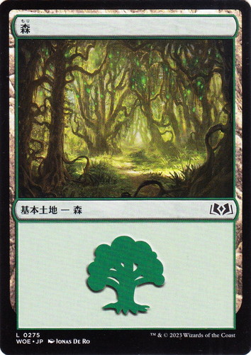 ![]() ![]() | WOE 0275 森 基本土地 エルドレインの森 L 色:緑 サブタイプ:森 illust:JONAS DE RO |