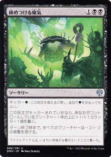 ![]() ![]() | DMU 086 締めつける瘴気 ソーサリー 団結のドミナリア U 色:黒 マナコスト:(1)(黒)(黒) キッカー(緑)この呪文を唱えるに際し、追加で(緑)を支払ってもよい。) この呪文がキッカーされていたなら、あなたがコントロールしているクリーチャー1体の上に+1/+1カウンター1個を置く。 ターン終了時まで、すべてのクリーチャーは-2/-2の修整を受ける。 ファイレクシア人は、いまだに呼吸が必要だということに驚いた。 illust:IKKA SCHULZ |