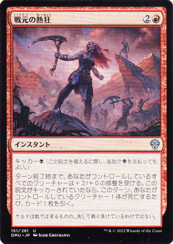 ![]() ![]() | DMU 151 戦元の熱狂 インスタント 団結のドミナリア U 色:赤 マナコスト:(2)(赤) キッカー(黒)(この呪文を唱えるに際し、追加で(黒)を支払ってもよい。) ターン終了時まで、あなたがコントロールしているすべてのクリーチャーは+2/+0の修整を受ける。この呪文がキッカーされていたなら、このターン、あなたがコントロールしているクリーチャー1体が死亡するたび、カード1枚を引く。 ケルドは数では劣るものの、決して競り負けているわけではない。 illust:IGOR GRECHANYI |