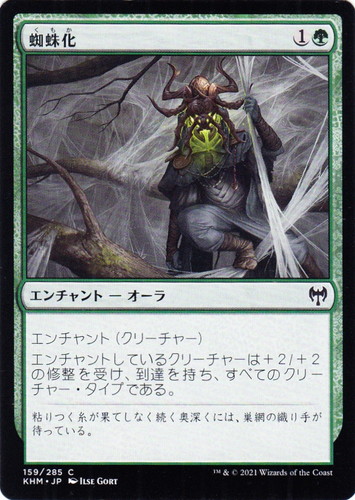 ![]() ![]() | KHM 159 蜘蛛化 エンチャント カルドハイム C 色:緑 サブタイプ:オーラ マナコスト:(1)(緑) エンチャント(クリーチャー) エンチャントしているクリーチャーは+2/+2の修整を受け、到達を持ち、すべてのクリーチャー・タイプである。 粘りつく糸が果てしなく続く奥深くには、巣網の織り手が待っている。 illust:ILSE GORT |
