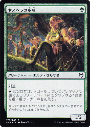 ![]() ![]() | KHM 178 ヤスペラの歩哨 クリーチャー カルドハイム C 色:緑 サブタイプ:エルフ・ならず者 マナコスト:(緑) パワー:1 タフネス:2 到達 [T], あなたがコントロールしていてアンタップ状態であるクリーチャー1体をタップする:好きな色1色のマナ1点を加える。 エルフの精鋭たちが放つ矢は、自分たちが崇める星界の大蛇の牙のように正確で致命的だ。 illust:RAOUL VITALE |