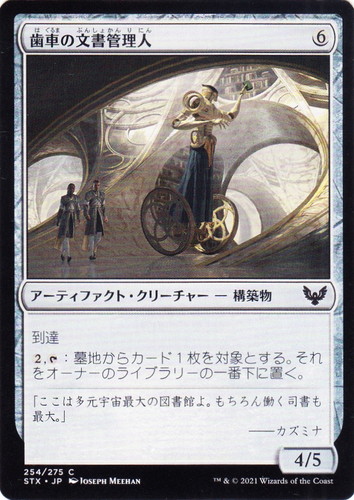 ![]() ![]() | STX 254 歯車の文書管理人 アーティファクト・クリーチャー ストリクスヘイヴン:魔法学院 C 色:無色 サブタイプ:構築物 マナコスト:(6) パワー:4 タフネス:5 到達 (2), [T]:墓地からカード1枚を対象とする。それをオーナーのライブラリーの一番下に置く。 「ここは多元宇宙最大の図書館よ。もちろん働く司書も最大。」 ――カズミナ illust:JOSEPH MEEHAN |