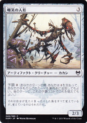 ![]() ![]() | KHM 246 嘲笑の人形 アーティファクト・クリーチャー カルドハイム C 色:無色 サブタイプ:カカシ マナコスト:(3) パワー:2 タフネス:3 予顕(0)(あなたのターンの間、あなたは(2)を支払って、あなたの手札からこのカードを裏向きに追放してもよい。後のターンに、これの予顕コストでこれを唱えてもよい。) それは自分が見たり負ったりした傷をすべて覚えているが、覚えているのはそれだけだ。 illust:WAYNE REYNOLDS |