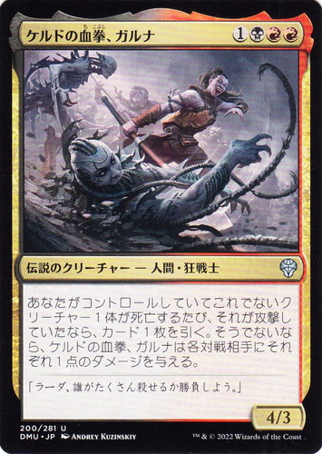 ![]() ![]() | UMA 200 血の炎、ガルナ 伝説のクリーチャー アルティメットマスターズ U 色:黒/赤 サブタイプ:人間・戦士 マナコスト:(3)(黒)(赤) パワー:3 タフネス:3 瞬速 血の炎、ガルナが戦場に出たとき、あなたの墓地にありこのターンにいずれかの領域からあなたの墓地に置かれたクリーチャー・カードをすべてあなたの手札に戻す。 あなたがコントロールしている他のクリーチャーは速攻を持つ。 illust:WINONA NELSON |