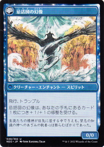 ![]() ![]() | NEO 048 語られざるものの警告 エンチャント 神河:輝ける世界 U 色:青 サブタイプ:英雄譚 マナコスト:(3)(青)(青) (この英雄譚が出た際とあなたのドロー・ステップの後に、伝承カウンター1個を加える。) [1]次のあなたのターンまで、あなたがコントロールしていないすべてのクリーチャーは-2/-0の修整を受ける。 [II]あなたの手札のカードが1枚以下であるなら、カード4枚を引く。そうでないなら、占術2を行い、その後カード2枚を引く。 [III]この英雄譚を追放する。その後、これを変身させた状態であなたのコントロール下で戦場に戻す。 両面:忌話図の幻像 illust:JENN RAVENNA TRAN |