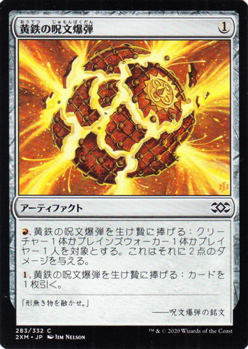 ![]() ![]() | 2XM 283 黄鉄の呪文爆弾 アーティファクト ダブルマスターズ C 色:無色 マナコスト:(1) (赤), 黄鉄の呪文爆弾を生け贄に捧げる:クリーチャー1体かプレインズウォーカー1体かプレイヤー1人を対象とする。これはそれに2点のダメージを与える。 (1), 黄鉄の呪文爆弾を生け贄に捧げる:カードを1枚引く。 「形無き物を融かせ。」 ――呪文爆弾の銘文 illust:JIM NELSON |