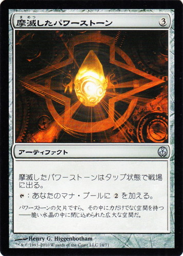 ![]() ![]() | DDE 024 摩滅したパワーストーン アーティファクト デュエルデッキ ファイレクシアvsドミナリア連合 U 色:無色 マナコスト:(3) 摩滅したパワーストーンはタップ状態で戦場に出る。 [T]:あなたのマナ・プールに(2)を加える。 パワーストーンの欠片ですら、その中に力だけでなく空間を持つ――脆い水晶の中に閉じ込められた広大な空間だ。 illust:Henry G. Higgenbotham |