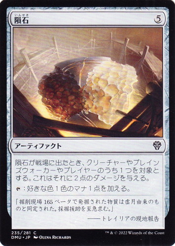 ![]() ![]() | DMU 235 隕石 アーティファクト 団結のドミナリア C 色:無色 マナコスト:(5) 隕石が戦場に出たとき、クリーチャーやプレインズウォーカーやプレイヤーのうち1つを対象とする。これはそれに2点のダメージを与える。 [T]:好きな色1色のマナ1点を加える。 「掘削現場165ベータで発掘された物質は虚月由来のものと同定された。採掘援助を至急求む。」 ――トレイリアの現地報告 illust:OLENA RICHARDS |