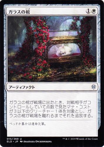 ![]() ![]() | ELD 015 ガラスの棺 アーティファクト エルドレインの王権 U 色:白 マナコスト:(1)(白) ガラスの棺が戦場に出たとき、対戦相手がコントロールしていて点数で見たマナ・コストが3以下のクリーチャー1体は対象とし、ガラスの棺が戦場を離れるまでそれを追放する。 ベッドか墓かは運命次第。 illust:ANASTASIA OVCHINNIKOVA |